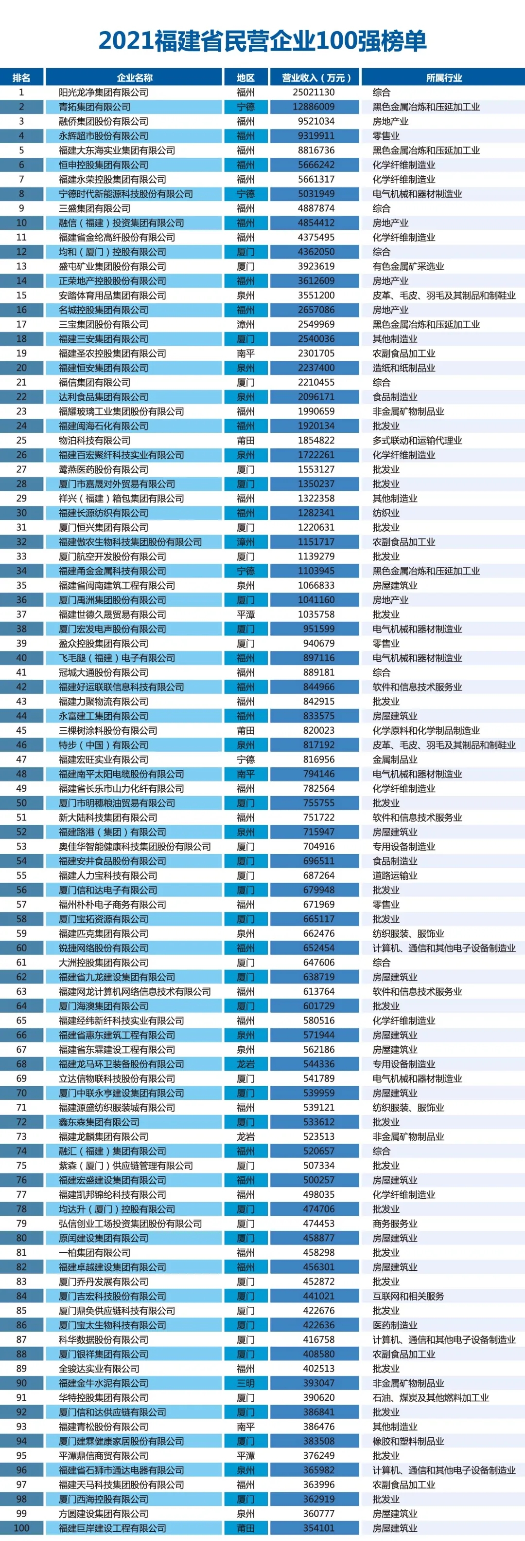 會(huì)上,省委統(tǒng)戰(zhàn)部副部長、省工商聯(lián)黨組書記李家榮代表省工商聯(lián)發(fā)布了“2021福建省民營企業(yè)100強(qiáng)”“2021福建省創(chuàng)新型民營企業(yè)100強(qiáng)”“2021福建省民營企業(yè)制造業(yè)50強(qiáng)”榜單。“2021福建省民營企業(yè)100強(qiáng)”中,廈門恒興集團(tuán)有限公司位列第31位,廈門寶拓資源有限公司位列第58位。