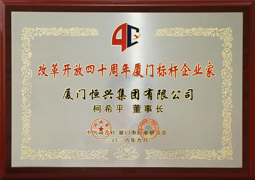 金秋迎盛會,改革促發(fā)展。9月8日,在第二十屆中國國際投資貿(mào)易洽談會開幕之際,中國商報社、廈門市商業(yè)聯(lián)合會攜手主辦的“改革開放四十周年廈門標(biāo)桿企業(yè)家、創(chuàng)業(yè)精英、助力品牌、創(chuàng)新品牌”推選活動在廈門舉行頒獎儀式,61家企業(yè)家和品牌獲得殊榮。廈門恒興集團柯希平董事長榮獲“改革開放四十周年廈門標(biāo)桿企業(yè)家”榮譽稱號。