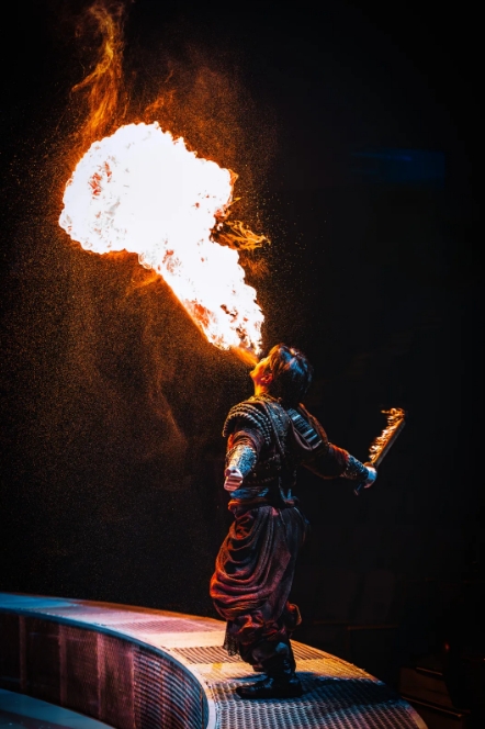 “本次升級,我們采用“天幕地屏+激光投影”的立體舞臺設計,打破了傳統(tǒng)演出的空間限制,給觀眾帶來前所未有的沉浸式體驗。”導演閔銳接受采訪時說,“《王的戰(zhàn)車》以北方部落的古老傳說為藍本,將傳統(tǒng)技藝與現(xiàn)代科技巧妙融合。比如縵吊演員的表演象征著部落信仰的升華,而噴火表演則象征著勇士的熾熱斗志。整場演出既保留了傳統(tǒng)雜技的力量與驚險,又通過全息投影技術等科技手段賦予其全新的藝術表達,希望觀眾在觀演的過程中,除了感受到震撼,也能體會到中國傳統(tǒng)文化的深厚底蘊與傳承。